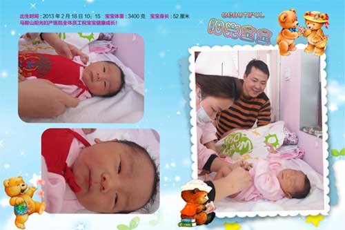 恭喜马鞍山向山镇的王女士,于2013年2月18日10:15在我院顺利产下一男孩;宝宝体重3400g,身长52cm!